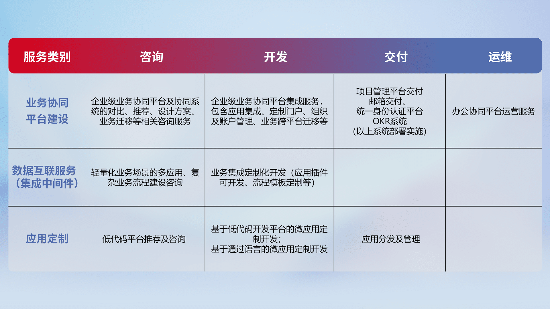 针对钉钉、、、企微、、、IDaas等平台级产品提供产品的规划、、方案、、交付、、、、定制化开发等服务,,实现如统一协同办公、、、智能客户服务、、、混合会议管理、、智能数据查询、、、、等业务场景,,,,实现数字化转型。。。。